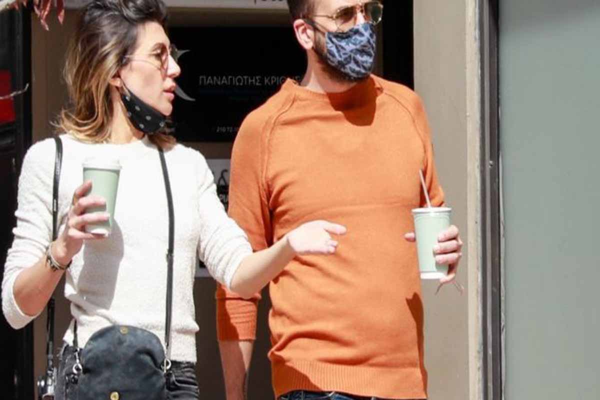 Οι δυο τους φορώντας τις απαραίτητες μάσκες προστασίας, πήραν τον καφέ τους στο χέρι και περπάτησαν μαζί μέχρι το άγαλμα του Δρομέα στο Χίλτον, όπου τοποθέτησαν ένα prop που κουβαλούσαν και ξεκίνησαν τη φωτογράφιση.